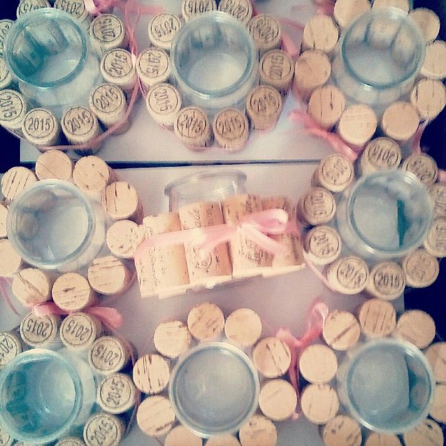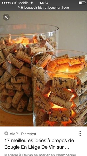 Un petit aperçu de mes bougeoirs en bouchons de Liège pour les centres de table ( il y en aura 5 par tables de couleurs différentes) ils seront accompagnés de bouteilles de vin bombées en guise de vases ... 180 invités 21 tables et tout fait main...