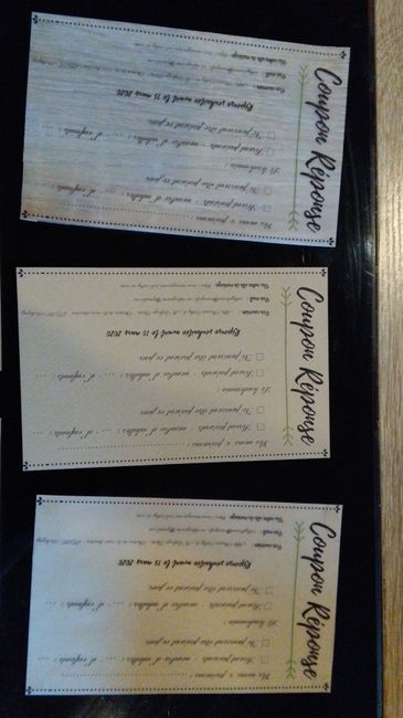 Coucou la commu, Nous commençons les faire part en janvier, donc je suis en plein test pour savoir ce qui nous plaît. Et voilà ce que ça donne après 4 ou 5 essais. Je suis juste indécise pour le coupon réponse (je sais pas si la photo donne bien)...