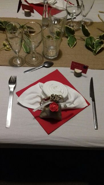 Voilà notre petite essai. Le centre de table avec les vases est au bout parce que le jour J il y aura deux tables en enfilade ! !! J'ai comme l'impression qu'il manque quelque chose ??!!