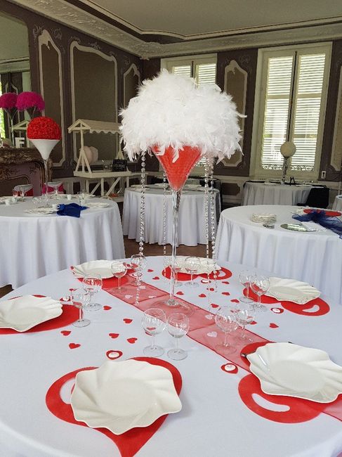 Cet après midi nous avons était faire un essai pour les tables, qu'est ce que vous en pensez? Sachant que le chemin de table et les noeuds de chaise seront en satin et non en organza et les assiettes seront rondes