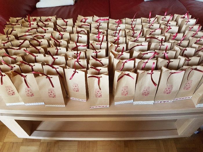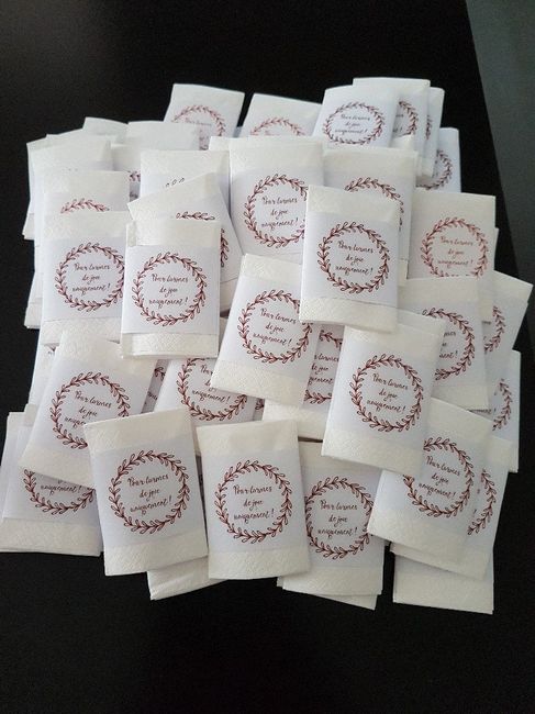 Bonjour tout le monde A 1 semaine du mariage on a passé 2h a assembler les 93 welcome bag pour nos invités. On a mis dedans : - un itinéraire - une explication wedshoot - un noeud de voiture - un flacon a bulles - un mouchoir - un carambar Vivement...