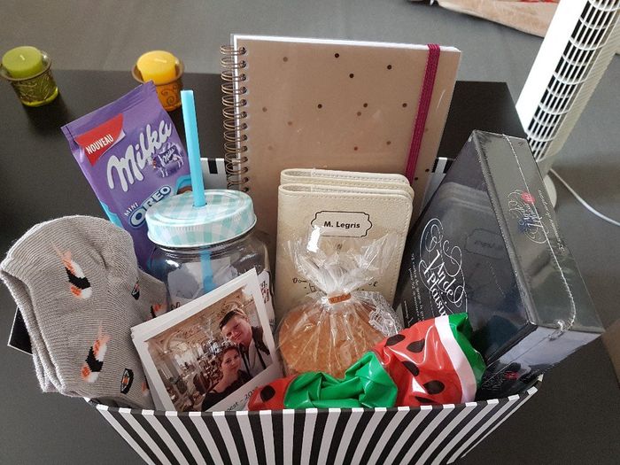 Coucou tout le monde J'ai offert à mes 2 témoins (mes soeurs) des kits la veille du mariage. Elles ont adoré le principe et ont vraiment été touchées. Dedans j'ai mis : - un tote bag personnalisé - une chope avec une paille - 2 mini pates a tartiner...