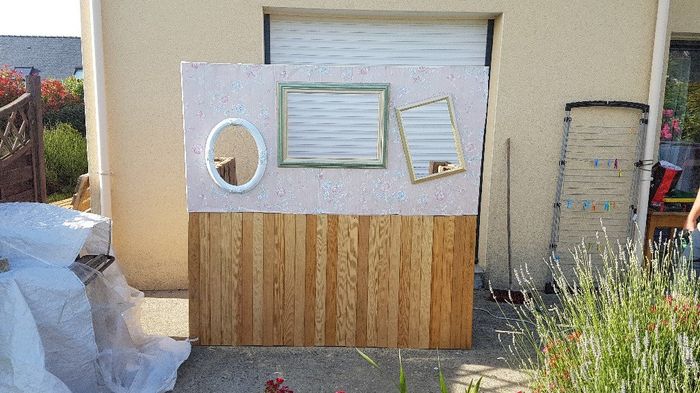 Voila mon panneau candy bar sur lequel j'ai agrafé un tissu liberty et ma banderole que j'ai fait.Le panneau est fait pour cacher un peu le mur bleu petrole de la salle là ou sera mi mon candy bar...Il sera poser sur une ancienne table singer sur...