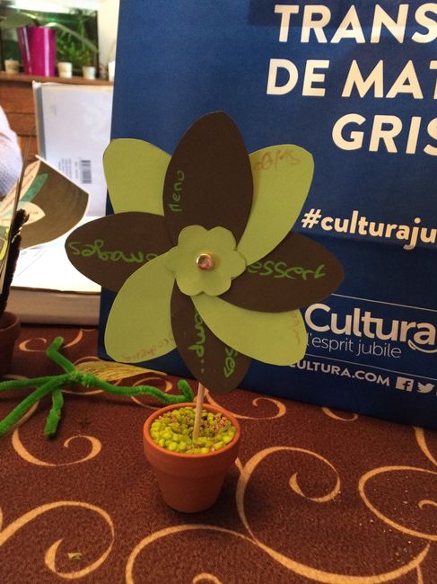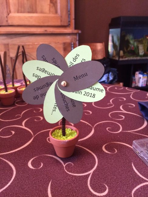 Bonjour à toutes! Voici un premier prototype de la facon dont nous souhaiterions mettre en place le menu. Avec chaque plat marqué sur un pétale. Le pot sera également décoré je ne sais pas encore comment. Qu’en pensez vous?