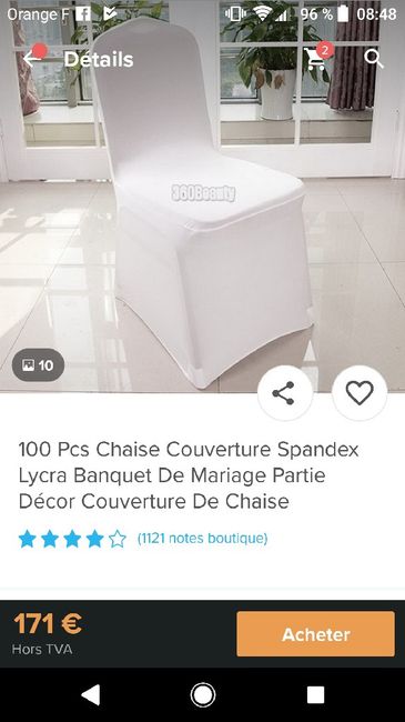 Coucou les b and g to be ! Chéri aimerait des housses de chaises en lycra, du coup je suis dans mes recherches. J'ai trouvé une offre intéressante sur wish. 171€ les 100. Du coup moins cher que de la location. Jme dis que je pourrai les revendre...