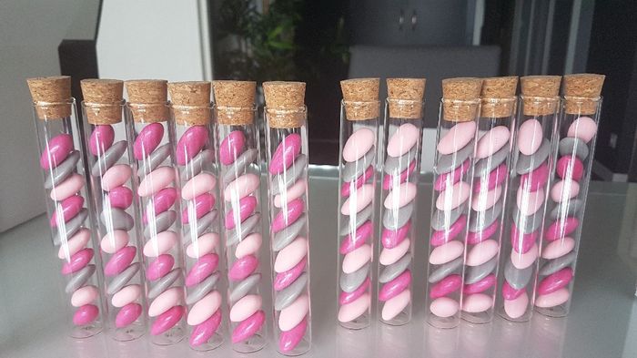 Voilà l'occupation d'une partie de l'après-midi... Le remplissage des tubes avec les dragées! Patience oblige car tout ne vas pas du premier coup. Ce n'est pas ma qualité première donc j'en ai fait que quelques uns 😉