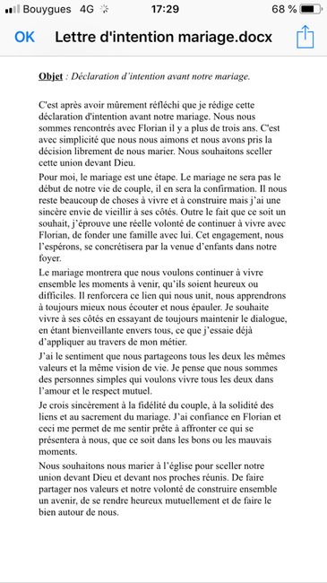 Coucou!!! J’ai rédigé ma lettre d’intention pour notre mariage à l'église ! Pouvez-vous me dire ce que vous en pensez? Je me suis inspirée de lettres sur internet... Est-ce que ça se fait de la donner sous forme « écrite à l’ordi » au prêtre ? Ou...