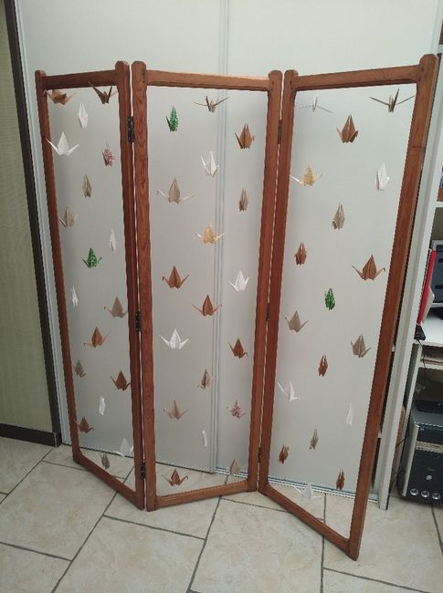 Et voilà ! J'ai fini (pour ce que je peux faire en avance) mon décor pour le photobooth! On a decapé et reteinté le vieux paravent de mes arriÚre grands parents avec mon papa, et j'ai accroché les grues. Il ne reste plus qu'à déplier leurs ailes et...