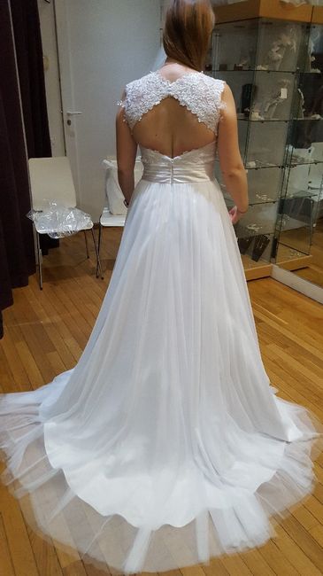 Bonjour, Essayage aujourd'hui de la robe après les retouches. J'ai été obligée d'agrandir de 1cm de chaque côté sinon impossible de respirer. par contre la robe "tombe" un peu et du coup, j'aime beaucoup moins le dos car j'avais pas autant de pli (et...