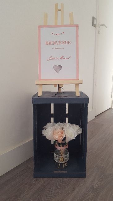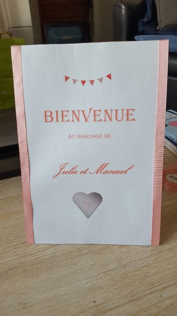 Bonsoir, Petite tentative du soir avec un panneau bienvenue au format A4. Il ira sur un chevalet de peintre devant la salle de réception. Qu'en pensez vous?