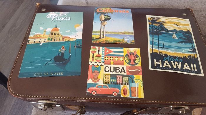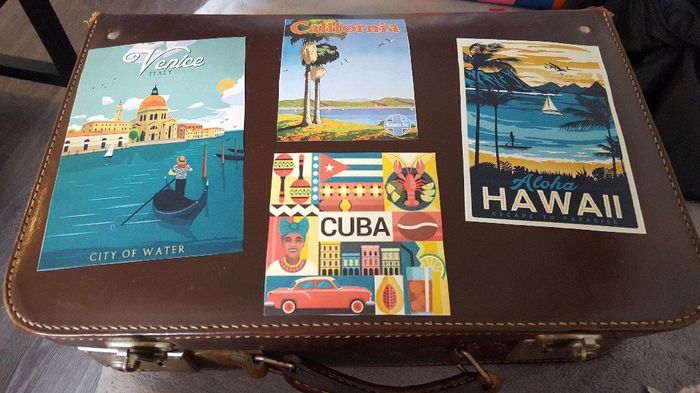 Bonjour, J'ai déniché une valise sur une brocante et j'ai voulu la customiser. Du coup, voici le résultat. Vous en pensez quoi?