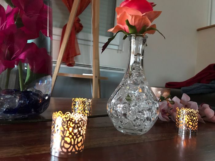 Bonsoir ! un de mes vase pour les centres de table ! Avec bougies led au fond qui change de couleur 😍😍 je suis une gamine!!😂 faut bien s’amuser en même temps ! bonne soiree ! Bon préparatifs à vous !