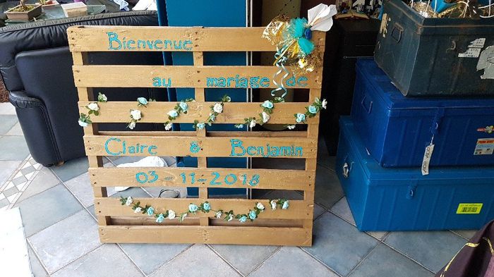 Bonjour tout le monde! Voilà je finalise mon panneau de bienvenue et j'ai un doute sur un détail. Je voulais mettre un noeud bleu et un doré pour faire un petit rappel des noeuds de voitures mais je ne sais pas trop si le bleu a vraiment sa place qq...