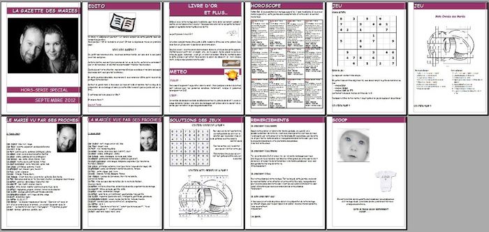 bonjour, je ne sait pas si vous en faite mais moi pendant mon vin d'honneur il sera distribué une gazettz personnalisé! j'ai quelques idées mais il me manque des textes, AIDEZ-MOI!!!!! il me manque des question quizz, certain texte d'horoscope et...