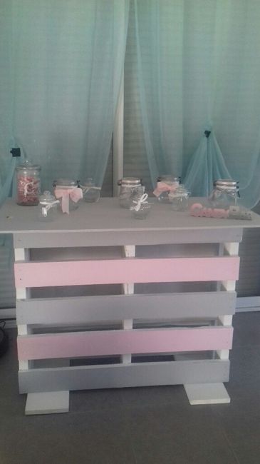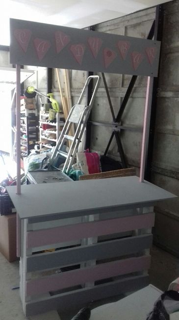 Candy bar bientot terminer il y aura 2 grand morceaux de bois rose sur chaque coter et l'ecriteau sera fixer dessus il y aura aussi 2 arbres a bonbonsque je ferai la veille.