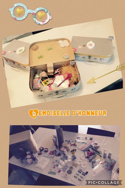 Et voilà, fait de mes petites mains : mes demandes de témoins, pour mon chéri il voulait simple donc jai juste mis un petit mot dans un cahier et dans un bloc note et pour moi mes témoins on eu une fiole avec un petit texte et mes DH une valise avec...