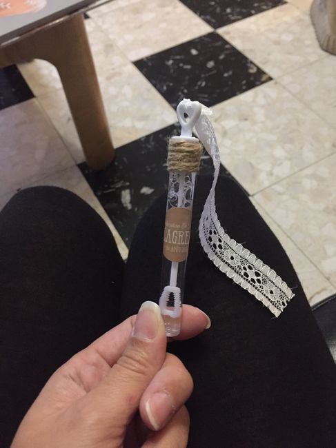 Nous n’avons pas encore fini car c’est tres long mais voilà 143 tubes où on a mis la solution savonneuse, les étiquettes de notre mariage. Et il reste à finir mais on mis de la dentelle et du fil naturel 😉