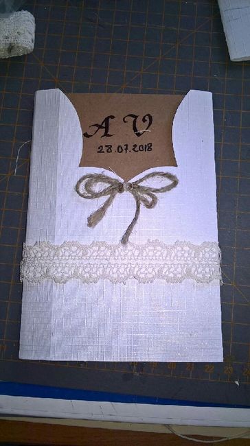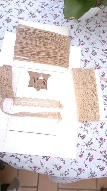 Préparation en cours ..... ou en somme nous ?! Nous devons colorer la dentelle car elle ne ressortaispas sur la pochette blanche ... Le noeuds en ficelle ne sera pas tout à fait comme cela mais avec une ficelle plus fine et moins effilochee ! Nous...
