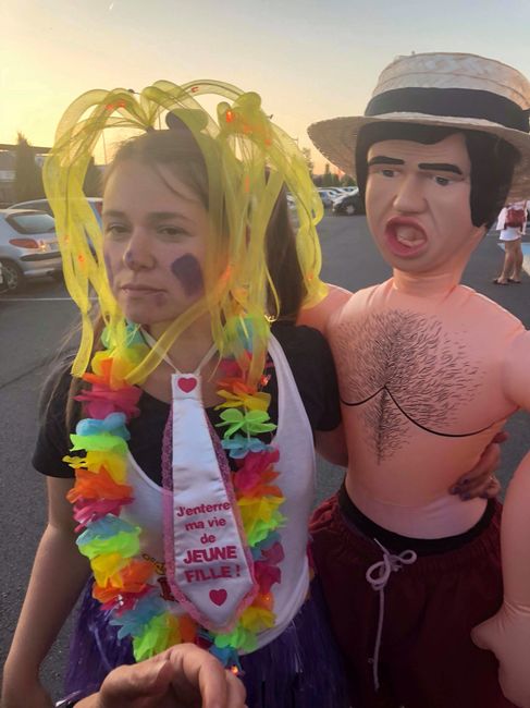 Cc la commu samedi j'ai fait mon EVJF et j'ai adoré 😜 On m'a bandé les yeux et jai dû me maquiller sans regarder. Ensuite on m'a enfilé mon 1er déguisement (déguisement zizi), jai eu ensuite un déguisement "capote" avec une photo rigolote de mon...