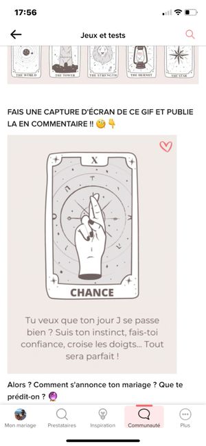 Coucou tout le monde 💜 Merci d'avoir participé jusqu'au bout ! Maintenant qu'on en sait un peu plus sur ton mariage, on va pouvoir tirer les cartes... FAIS UNE CAPTURE D'ÉCRAN DE CE GIF ET PUBLIE LA EN COMMENTAIRE !! 🧐👇 Alors ? Comment s'annonce ton...