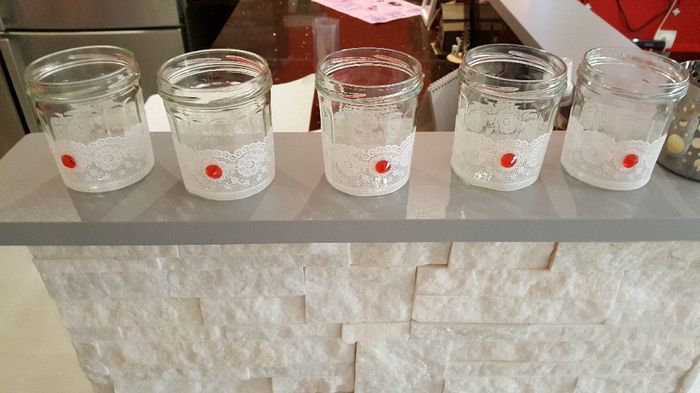 Coucou. J'ai fais des petits pots pour mettre sur mon escabeau. Je penses y mettre des fleurs composées par ma fleuriste. Qu'en pensez vous ? Positif comme négatif 😁 je rappelle pas de thème juste des couleurs rouge et blanc.