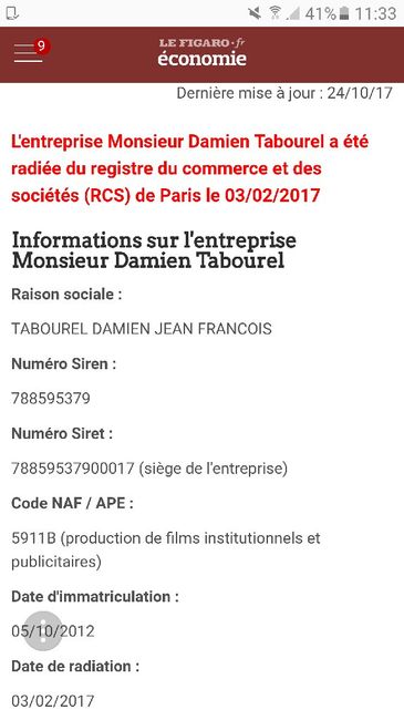Bonjour j’ai fait appel aux services de Damien Tabourel pour mon mariage et il s’avère que son site est fermé, que son mail est désactivé et qu’il ne répond plus au téléphone... je ne sais pas si quelqu’un a fait appel à ses services ou si quelqu’un...