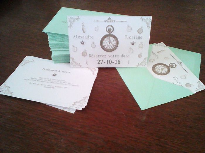 Hello à toutes ! Voilà mes StD, tout juste imprimé, je les est fait et imprimé moi-même, sur le thème du steampunk. Vu que les montres et les horloges sont un des gros symbole de ce courant artistique, on a trouvé que c'était l'idéal pour un StD....