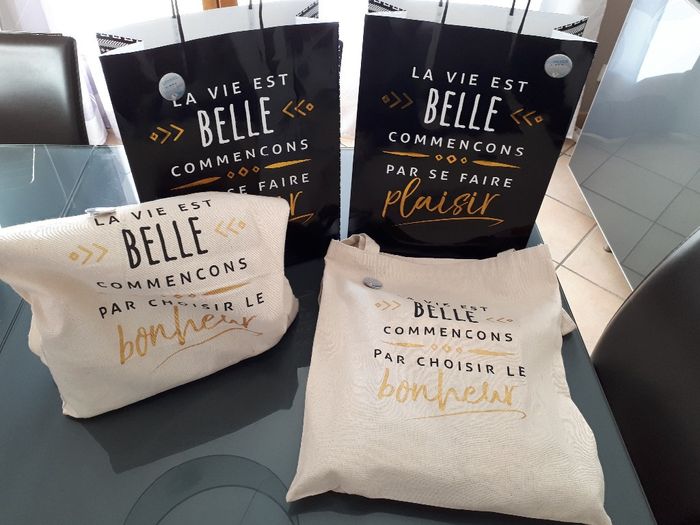 Hello la commu! Et voilà les sacs pour les témoins sont terminés!! Nous allons leur donner prochainement avec leurs cadeaux de Noël Voici de quoi ils sont composés : - Livret du parfait témoin - Un déo - Des pastilles à la menthe - Un stylo - Un...