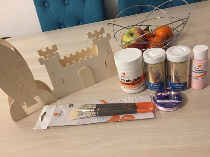 Hello la communauté ! Cet après-midi j'ai fait un petit tout chez Cultura, et je suis sortie avec de quoi customiser mes bocaux, et autres pots la laitière : de la colle, des paillettes et 6m de ruban rose clair. J'ai trouvé un petit château en bois...