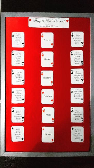 Coucou à toutes ! La date arrive à grand pas et je commence à paniquer lol ! J'aimerais vous montrer mon thème du mariage : roses et poker. Les boîtes à dragées sont montées, reste plus qu'à les garnir. Je viens de terminer les menus aujourd'hui mais...