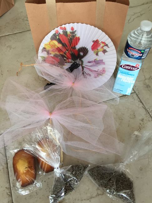 Voici les sacs invités que je suis en train de préparer A l’intérieur j’y mets : - 2 noeuds de voiture en tulle - une bouteille d’eau - 2 petites madeleines - un éventail - 2 sachets de lavandes - un paquet de mouchoirs J’hesite à mettre le nom des...