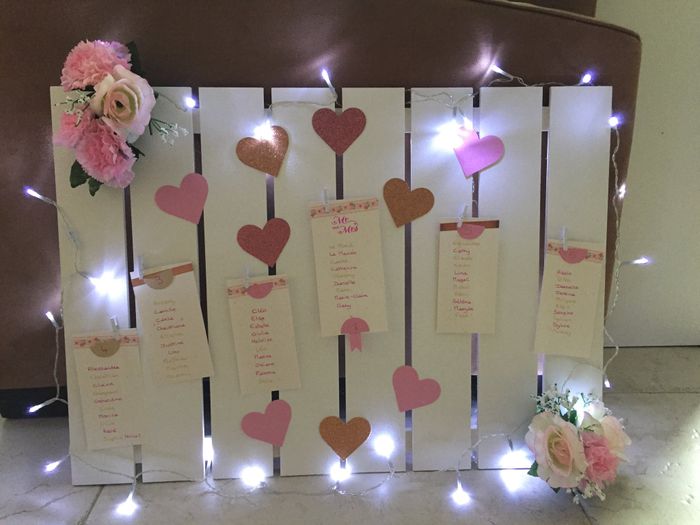 Ça y est, j’ai arrangé et finis mon plan de table J’ai rajouté des fleurs et la guirlande lumineuse car je le trouvais trop simple Qu’en pensez vous ? Après le mariage,je pense m’en servir comme pêle-mêle pour y mettre des photos