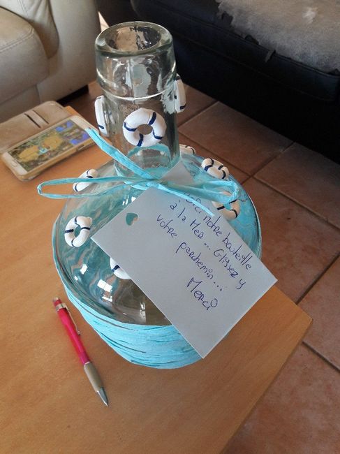 Coucou les filles me revoilà.... qui dit deuxième jour de congé dit deuxième jour de diy et avancées. Pour le coup c'était la customisation de ma bouteille à la mer. La rédaction de mon menu et le seconde couche de peinture de ma palette de bienvenue...