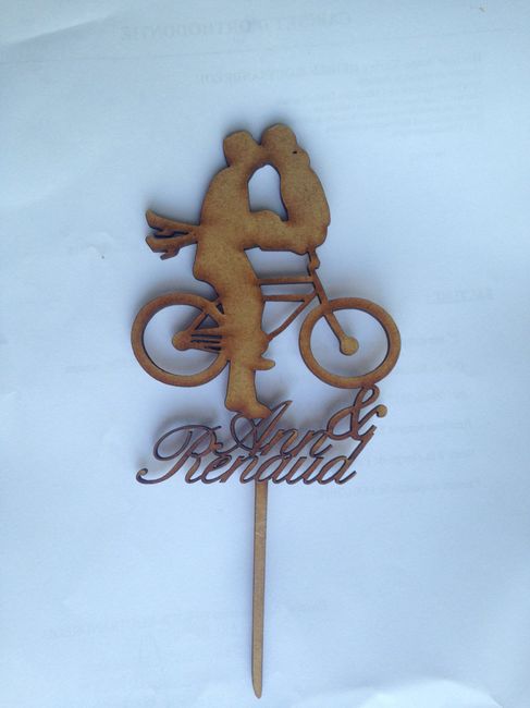 Nous avons reçu notre cake topper! Notre thème est la bicyclette ! Je vous conseilles vivement la société "au dernier étage ". Elle vous fait tout ce que vous voulez et tres réactif et envoie soigné ! On est ravi