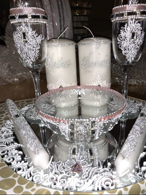 Bonsoir everybody, a J-3 j’ai reçu mon avant dernière commande Qui se compose d’un livre d’or avec stylo, d’un grand et un petit tableau, d’un bol avec verre bougies et plateau pour ma cérémonie du henné, d’une urne, du coussin pour les alliances et...
