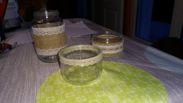 J'ai commencé la décoration de mes pots. Ils seront sur mes centres de table en bois. Certains serviront de photophore et d'autres auront des fleurs. Avec ou sans petit noeud ??? Je trouve que ça finit Qu'en pensez vous?