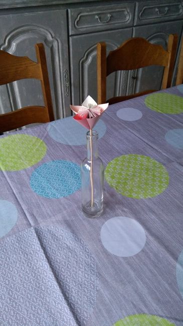 Hello J'avais un peu de temps cette semaine. Je me suis lancée dans la réalisation de fleurs. Après quelques tests voici le résultat final. Je peux la mettre dans le vase ( que je vais décoré) en centre de table, sur un rondin avec photophore et...