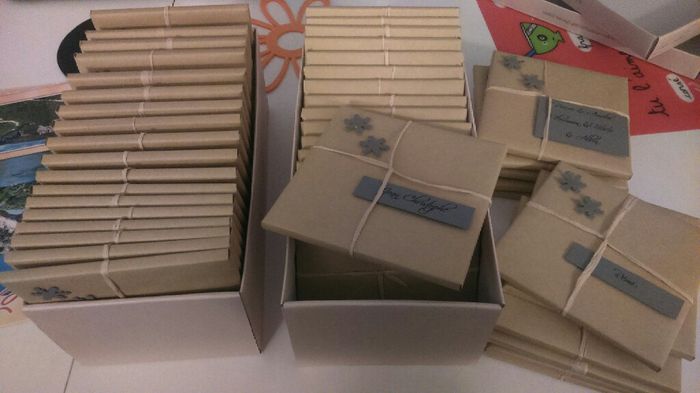 Nos petites boîtes pour nos associés ;-) !!! Hâte de les donner !!! Pour les témoins, on leurs à mit un grand carnet, un stylos personnalisé, un porte clés super témoins, un masque éclat, un badge témoin au top,du thé relaxation et des gourmandises !...