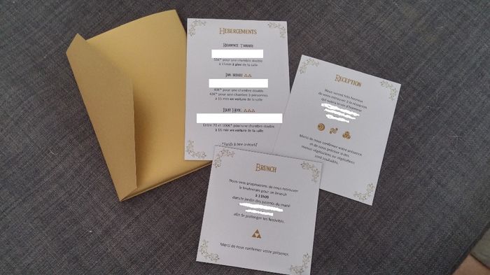 A 4 mois et demi du mariage, nous avons terminé nos faire-part la semaine dernière en nous inspirant d'un modèle de pocketfold (disponible dans les idées du forum) ! Nous avons voulu le faire en accord avec notre thème (le jeu-vidéo The Legend of...