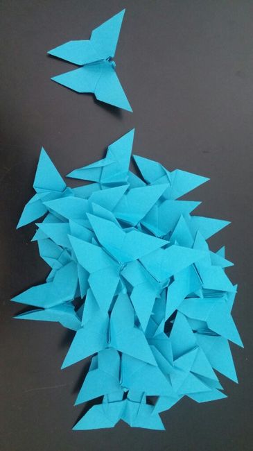 A 2 mois du mariage, on se met un petit coup de pression sur la déco (on a plus ou moins tout en tête mais rien de fait) alors ce soir c'est soirée pliage. Ces petits papillons azur (clin d'oeil à notre thème The Legend of Zelda) formeront un rideau...