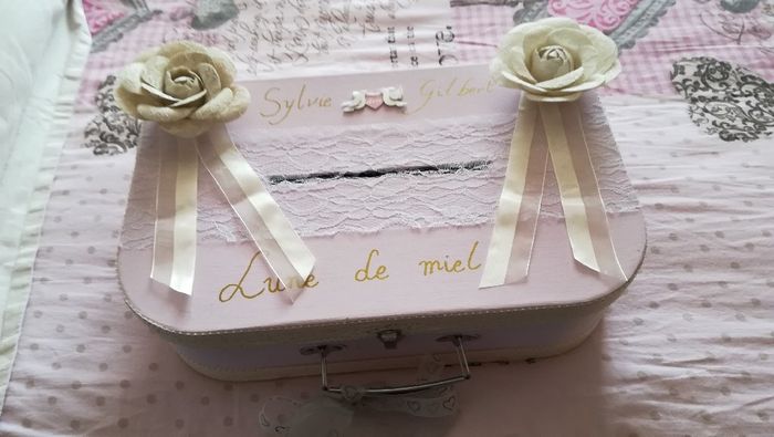 Voici le faire part de mariage, le livre d'or (photo book) l'urne l'une de miel , la boîte porte alliance... Fait maison, par ma fille et moi-même. Bonne journée à toutes