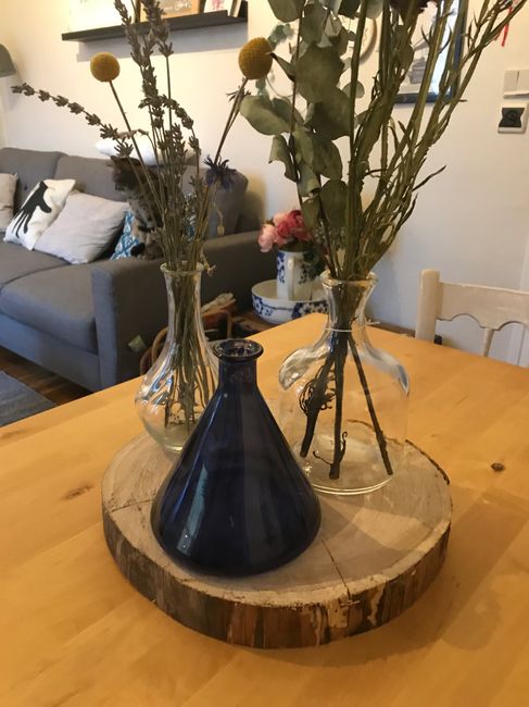 Cc les filles , Pouvez vous m aider , quelle genre de vase ou bouteille voyez vous sur mon rondin en bois , avec ou sans bougies MERCI (thème champêtre et fuschia avec des orchidées )
