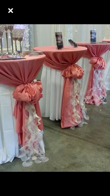 Si vous opter pour des tables mange-debout, il y a plusieurs façons de les habiller...en voilà’ quelques exemples...😉 je pense que moi je vais mettre un ruban doré avec une feuille tropicale au niveau du noeud 😉