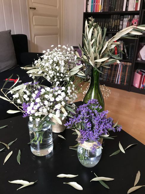 Salut la communauté ! je vais faire appel à votre capacité d’abstraction et à votre indulgence, voici mon premier essai de centre de table ! Ce sont 3 vases (il faut donc imaginer avec des FLEURS, genre gypsophile, rose, et je ne sais quoi... pis de...
