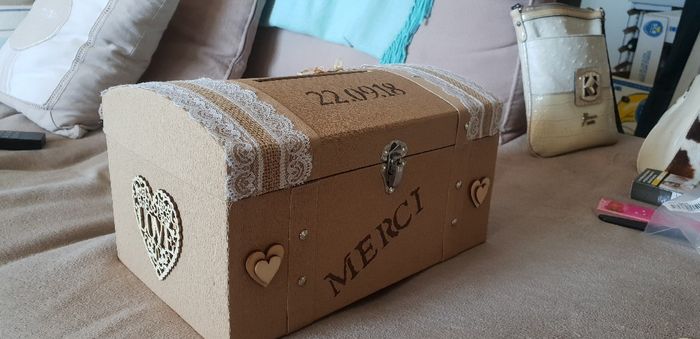 Voilà mon urne customisé 😁 pensez vous que je rajoute un ou deux coeur en bois ou cannes ça c'est bien ?