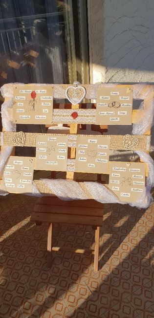 Voici mon plan de table sur une demi palette je rajouterai du lierre et je vais inscrire plan de table en haut je vous mettrai une photo