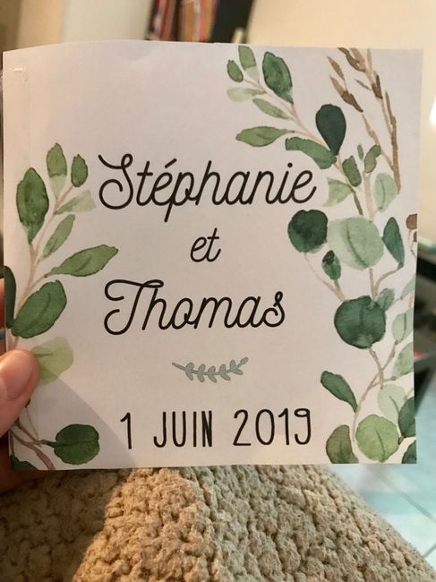 Premier brouillon pour notre faire part, avec branches d’eucalyptus (j’aimerais en avoir dans mon bouquet). Qu’en pensez-vous ?