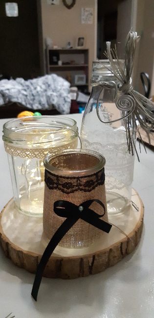Ce we, après des recherches infructueuses niveau rubans, jutte et ficelle de chanvre j'ai quand même fait une ébauche de deco de table et je suis plutôt contente du résultat... petit pot avec une bougie, pot confiture avec des leds et petite...