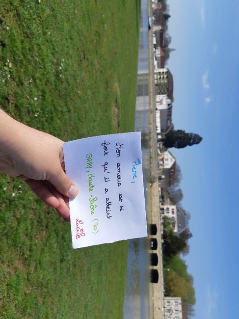 Bonjour je souhaiterais si possible faire un montage le jour j pour mon homme. Donc si vous pouvez m'envoyer des loves notes de vos villes ou pays. La phrase Yannick l'amour que Sandrine te porte a voyagé jusqu'à (ville). Merci d'avance Moi j'habite...
