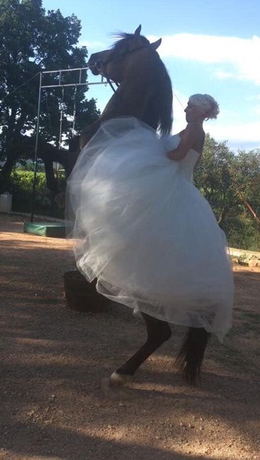 Voici ma surprise ... nous nous sommes mariés dans une école de cirque et je me suis régalée ! J adore les chevaux